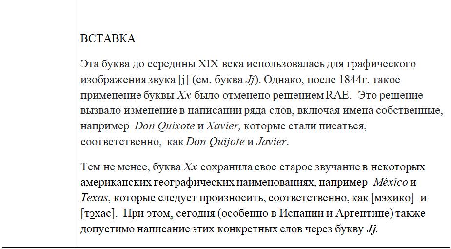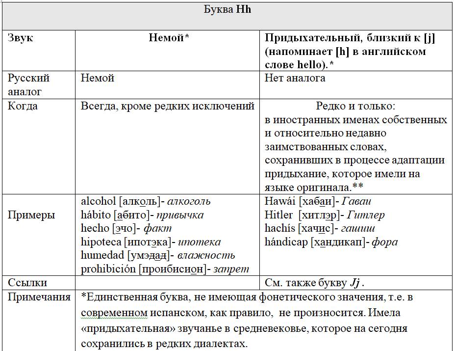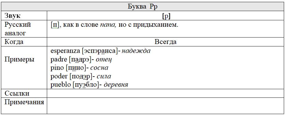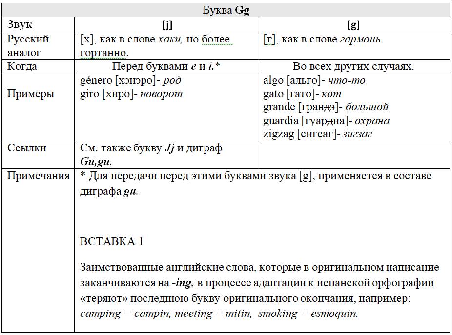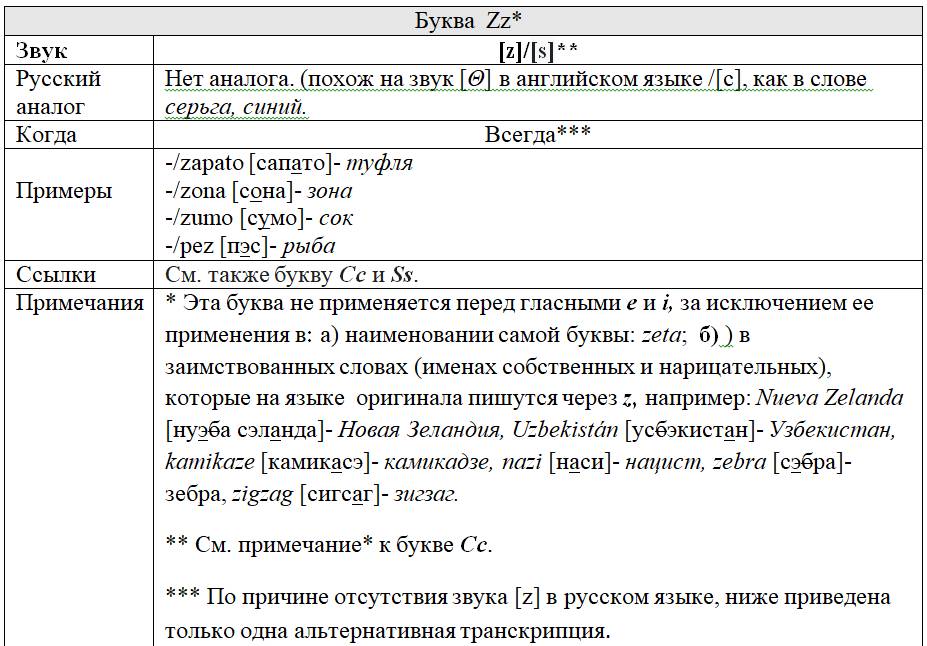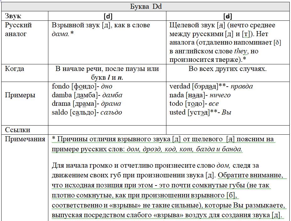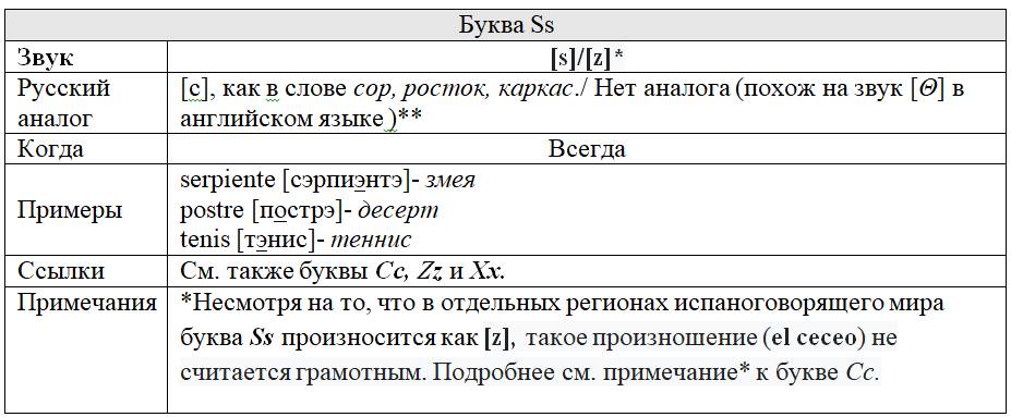 Каждой букве «посвящена» персональная таблица, в которой представлены следующие данные: какой/какие звуки она изображает графически и когда; есть ли русский аналог этих звуков и если да, то какой; примеры иллюстрирующие русский аналог и примеры испанских слов с этой буквой; перекрестные ссылки на другие буквы, изображающие такие же, либо схожие с ними звуки; информационные вставки об интересных фактах и др.