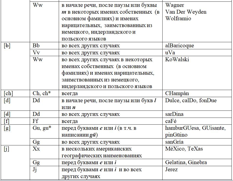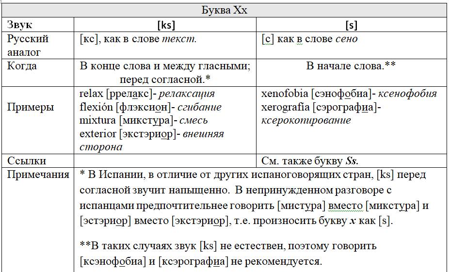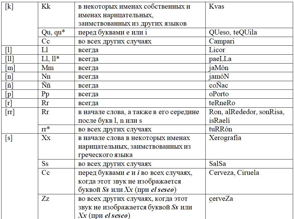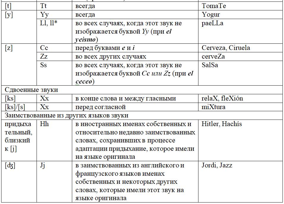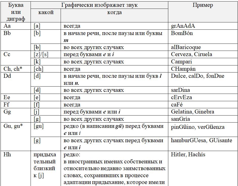 Как следует из предыдущих глав, с одной стороны, некоторые письменные знаки (буквы и диграфы) могут обозначать разные звуки или разные оттенки звука в зависимости от своего местоположения в слове или во фразе, с другой – некоторые звуки могут обозначаться разными знаками. Кроме того, буквы и диграфы могут иметь различное звучание по различным испаноговорящим регионам мира. Ниже, для удобства читателя приведены две таблицы, кратко и наглядно резюмирующие весь изученный нами материал. Первая систематизирует этот материал на базе знаков (27 букв и 5 диграфов), вторая – на базе звуков испанского языка (24 звука, из них два в двух вариантах: взрывном и щелевом), а также заимствованных звуков. Диграфы в обеих таблицах отмечены знаком «*».