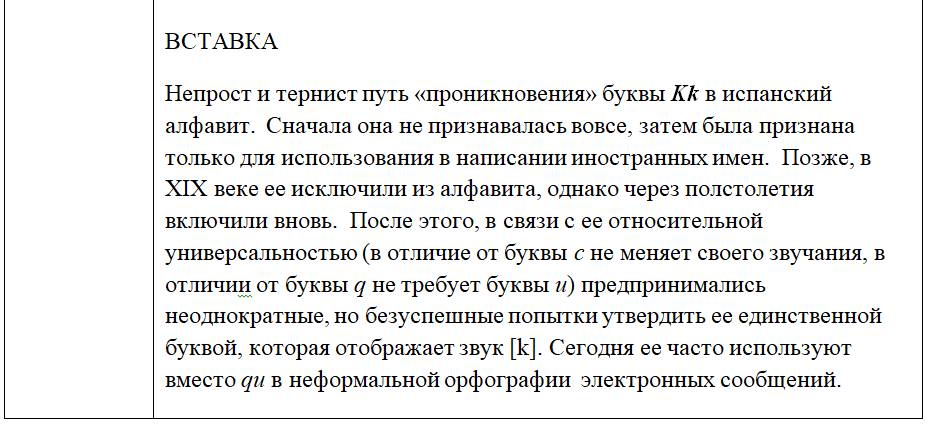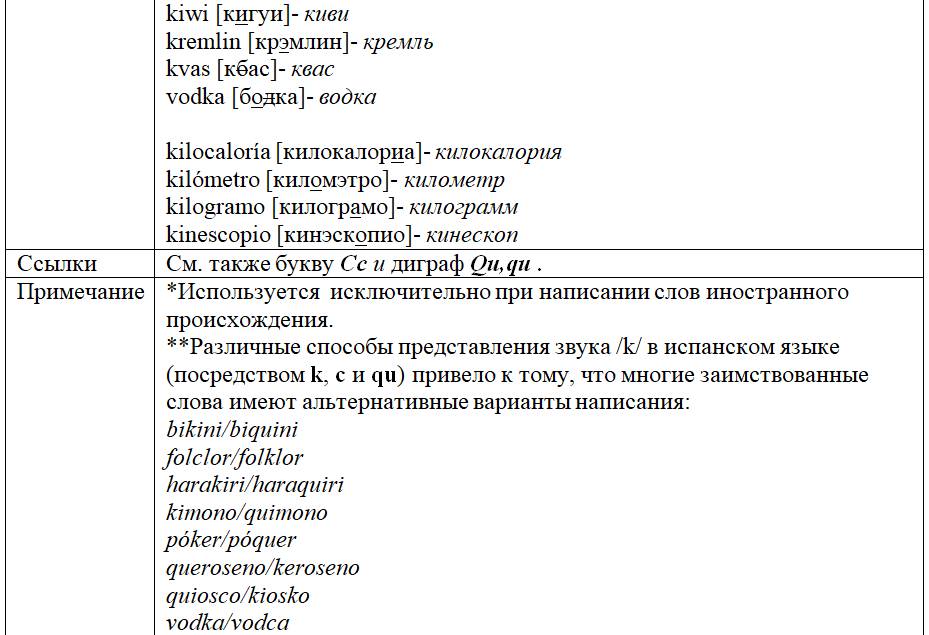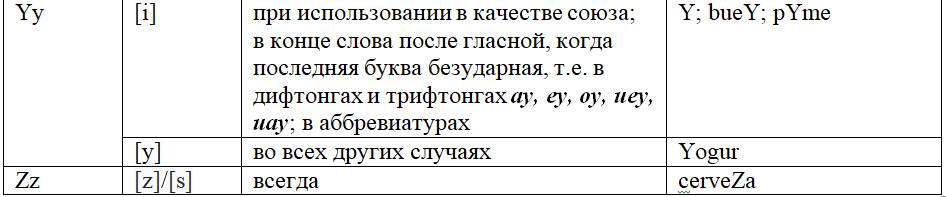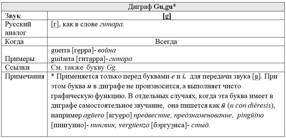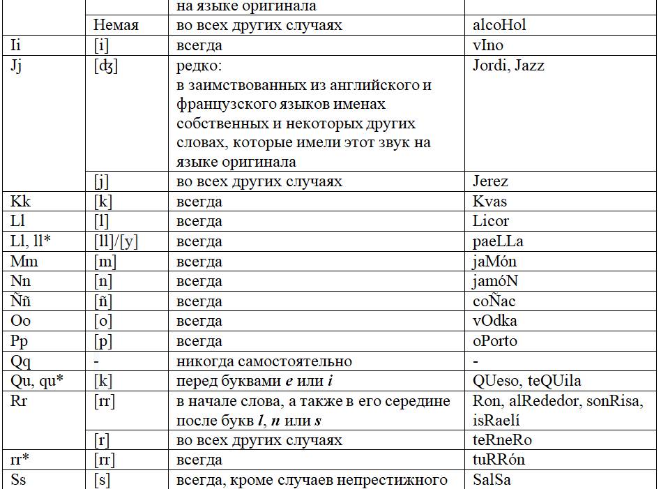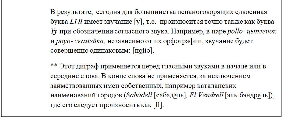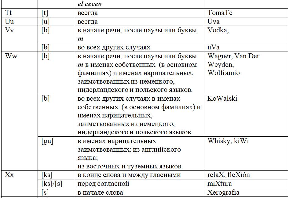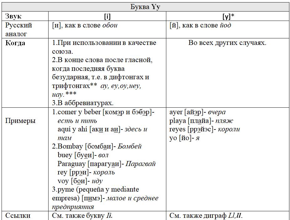 Как следует из предыдущих глав, с одной стороны, некоторые письменные знаки (буквы и диграфы) могут обозначать разные звуки или разные оттенки звука в зависимости от своего местоположения в слове или во фразе, с другой – некоторые звуки могут обозначаться разными знаками. Кроме того, буквы и диграфы могут иметь различное звучание по различным испаноговорящим регионам мира. Ниже, для удобства читателя приведены две таблицы, кратко и наглядно резюмирующие весь изученный нами материал. Первая систематизирует этот материал на базе знаков (27 букв и 5 диграфов), вторая – на базе звуков испанского языка (24 звука, из них два в двух вариантах: взрывном и щелевом), а также заимствованных звуков. Диграфы в обеих таблицах отмечены знаком «*».