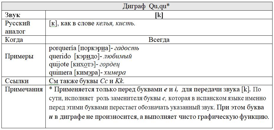 Однако, не все диграфы за долгую историю развития письменности были замененными на буквы. Сегодня в испанском языке по-прежнему используются пять диграфов: ch, ll, rr, gu и qu. Диграфы ch, ll, rr, обозначают звуки, не отражаемые одиночными буквами. На этом основании, как ни странно, первые два из них на протяжении более двух веков даже входили в состав испанского алфавита (под названиями, соответственно, che и elle) до тех пор, пока в 2010г. наконец не были изъяты из него согласно решению RAE. Диграф rr никогда не входил в алфавит, возможно потому, что он никогда не используется в начале слова. Что касается диграфов gu и qu, то их значение состоит не в обозначении каких-либо самостоятельных звуков, а в придании конкретных звучаний, соответственно, буквам g и q в конкретных обстоятельствах.