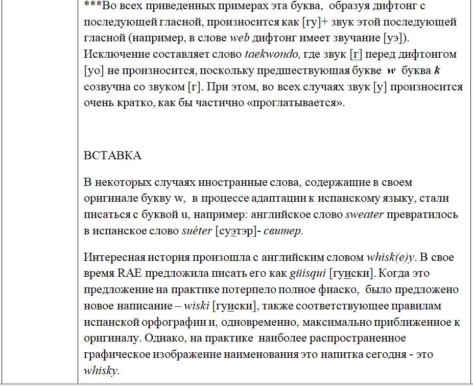 В свою очередь, буква Ww называется uve doble, поскольку «пришла на смену» диграфу VV (две буквы V, написанные одна за другой). В античной латыни отсутствовала, была заимствована из германских языков, «получила прописку» в испанском алфавите только в 1969г. Эта «новосел» алфавита наряду с другой относительно новой буквой Kk (окончательный разрешение RAE на прописку в алфавит датировано 1869г.) используется исключительно для написания слов, заимствованных из других языков.