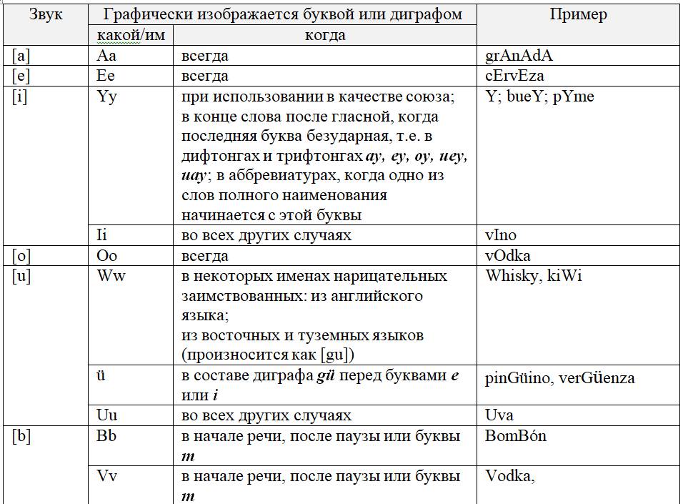 В испанском языке 24 звука, из них 5 гласных и 19 согласных. Эти звуки графически изображаются посредством букв, а также диграфов (письменных знаков, состоящих из двух букв).