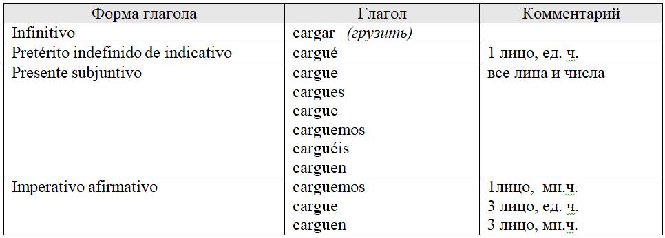 Если глагол в инфинитиве заканчивается на -car, то при спряжении буква с перед буквами e или i замещается диграфом qu: