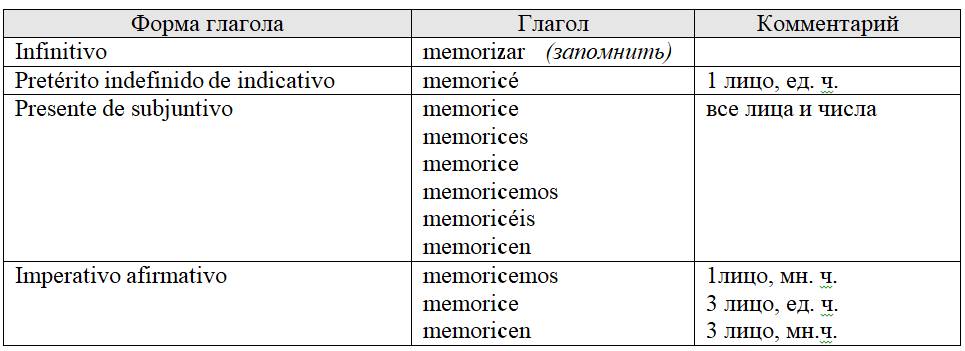 Если глагол в инфинитиве заканчивается на -zar, то при спряжении буква z перед буквами e или i замещается буквой c: