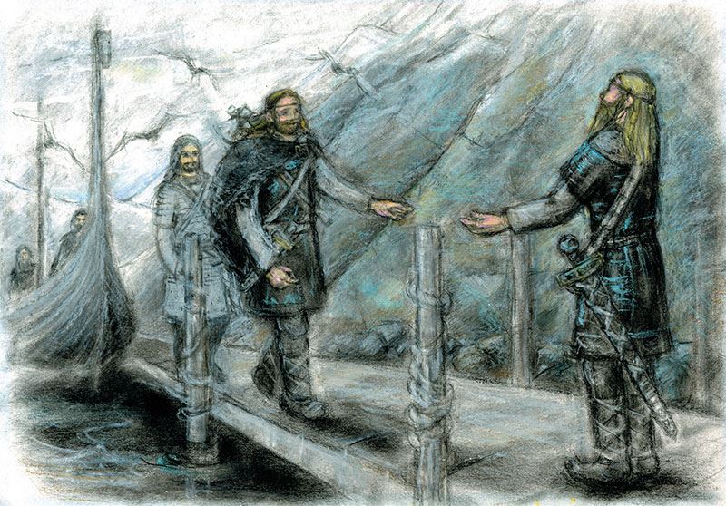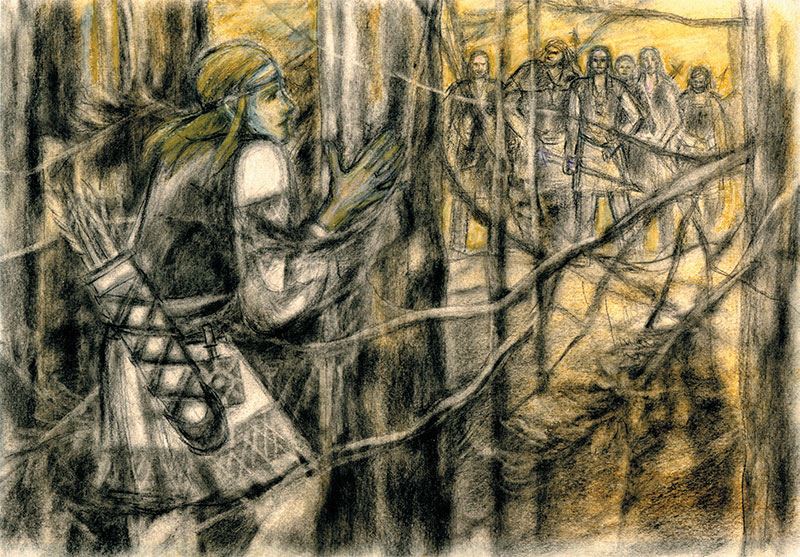 Был в дружине у Сигурда Синебородого отважный юноша, смелый воин, что уже в шестнадцать лет познал цвет крови врага и как звенит в сражении сталь меча. Ингви Зоркий было имя его. Утром третьего дня, когда все уже было готово к отплытию, решил Ингви сходить на охоту, потому что не терпело покоя сердце молодого викинга. Пятеро друзей отправились с ним. И вот какими были их имена: Корт Страшила, Фрелаф Молодой, Бьорн Тихий, Страви Бык и Фрегольд Ястреб. Взяли они с собой луки со стрелами, копья не самые длинные, ибо густ был лес, и, конечно, топоры их всегда при них оставались. Не хотел отпускать ярл своих дружинников на охоту, но, подумав, что при удаче будет у них мясо в запасе, дал согласие. Сказал лишь ярл, чтобы к заходу солнца быть им всем на корабле и что по третьему сигналу трубы отправятся в путь викинги и ждать никого не станут. Не было видно с драккаров ни одной живой души; лишь густой еловый лес начинался в трех десятках шагов от берега, только чайки кричали да ворон летал. Но не знали викинги, что все три дня следили за ними зоркие глаза, чутко прислушивались к звукам чужой речи уши людей, которые ходят по лесу тише, чем гибкая рысь, а бегут быстрее лося.