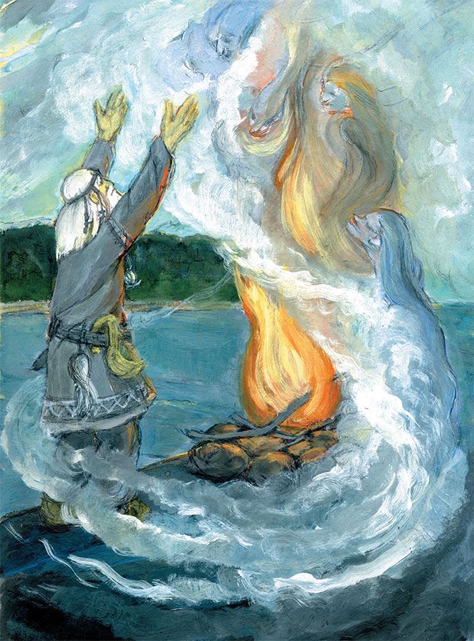 Тогда отправился старый колдун к черному камню, захватив с собой лосиные копыта, печень и сердце убитого зверя. Там разжёг он большой костер и начал созывать всех духов на пиршество: