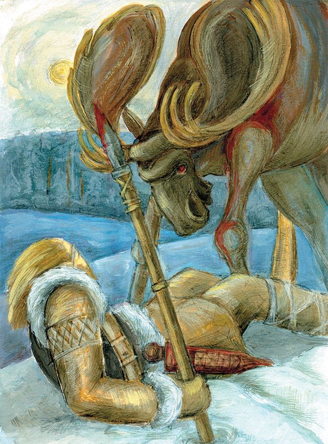 Ибо случилось так, что в короткие зимние дни, когда спит глубоким сном утомившаяся за лето Фрейя[247], отправился Ингви на охоту. Улыбнулась удача ему. Быстро нашел он свежий лосиный след. Старый был лось и могучий, густо ветвились рога его, и не знал он усталости в беге, хотя были снега глубоки. Ингви на лыжах преследовал неутомимо. Долго погоня длилась, но вот метнул свое копье Ингви, ранил он лося в шею. Разъярился раненый зверь, и бросился он на охотника, а у того только нож под рукою. Хотел отскочить за дерево Ингви, да лыжи сбросить не успел, а снег был глубок.