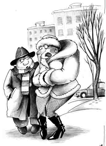 – Послушай, Панас, – произнесло бело-синее лицо Снегурочки, напоминавшее Зину, – меня эти контрразведывательные игрища уже достали. Я здесь стою с утра. Я вся околела, никуда нельзя отлучиться. Сколько я могу отбиваться от этих «кавказцев»? Это уже восьмые. Где твой «америкос»? Если он не появится в течение 10 минут, я всыплю ему и тебе!
