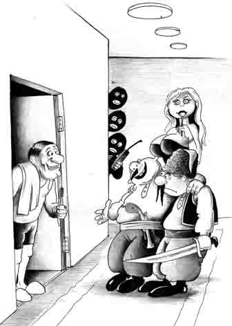 В это время в дальнем конце коридора замаячили фигурки приближавшегося «Беспредела». Поднялся небольшой шум. Но было уже поздно. Внезапно отворилась дверь под номером 820. Все застыли, как вкопанные. «Штуцер» такого никогда ещё не видел. Перед ним стояла полуобнаженная дива, а за ней, – те же самые персонажи, что и на картине И. Е. Репина «Запорожцы пишут письмо турецкому султану», репродукция которой висела в его номере. «Штуцер» невольно улыбнулся. У Панаса отвалился ус, и он первым пришёл в себя.