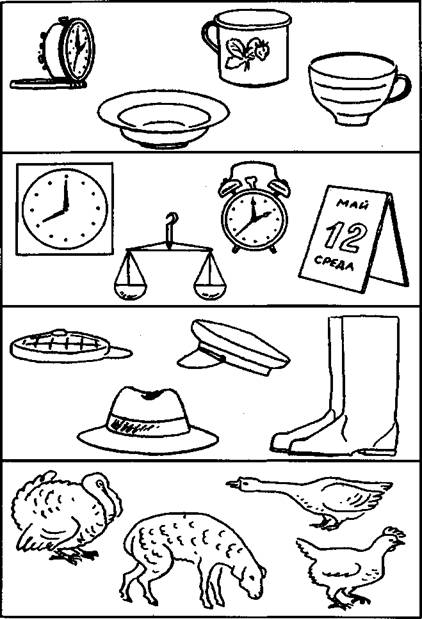 Тестов на владение понятиями (понятийным мышлением) существует множество, хотя все они в целом и довольно однообразны и преимущественно ориентированы на детский возраст. Всем известные простейшие тесты на исключение лишнего элемента в ряду предъявленных, где необходимо сначала обобщить максимальное число предметов по какому-нибудь одному существенному признаку и на этом же основании исключить из ряда тот предмет, которые не соответствует выбранному критерию.