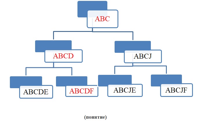 В представленной схеме по определению понятия ABCDF буквами ABC обозначены все существенные признаки условного явления (без любого из которых явление существовать не может), это явление и является родовым по отношению к нисходящим рядам других подобных явлений, имеющих в себе все эти существенные признаки и плюс ещё некоторые, существенные уже именно для этого вида (дополнительные существенные признаки, обозначенные уже новыми буквами, которые присоединяются к исходным существенным признакам). Таким образом, понятие с признаками ABCDF непременно "вбирает" в свои признаки и признаки родового понятия ABCD и родового понятия ещё более высокого уровня ABC, и через всю эту совокупность признаков понятие ABCDF и определяется, что схематически и обозначено.
