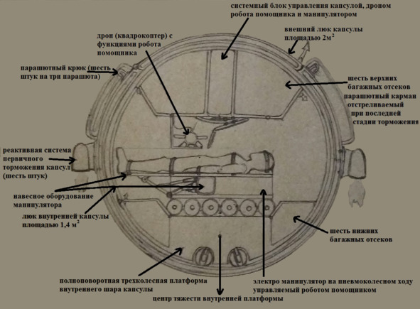 Я забрался внутрь своей капсулы, которая состояла из внешнего прочного шара диаметром три метра, толщиной стенок в семь сантиметров, и внутреннего шара с толщиной стенок пол дециметра. Между внутренним и внешним шаром был зазор в пару дюймов. Внутри было тесно. Внизу и вверху по окружности капсулы расположились двенадцать багажных отсеков, нижние шесть поменьше, а верхние побольше. Посредине потолка был большой экран, который можно было выдвинуть наружу.