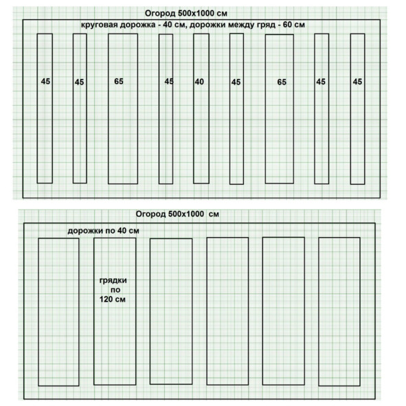 Возьмем участок под гряды размером 500х1000 см. С учетом списка овощных культур узкие гряды целесообразно делать двух размеров – шириной 45 и 65 см. Таким образом на участке можно разместить 6 гряд шириной 45 см, 2 гряды шириной 65. 1 гряду шириной 40 см. Ширина дорожек между грядами – 60 см. При длине 4,2 м у нас получается 18, 48 кв. м. полезной площади гряд.