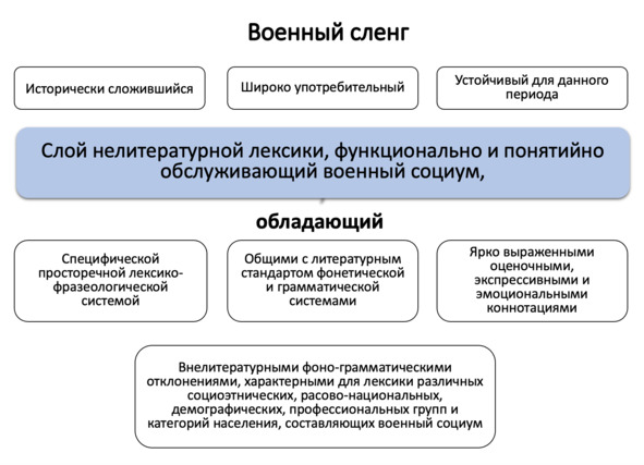 Обобщая и систематизируя изложенное мы можем определить военнный сленг как это исторически сложившуюся, относительно устойчивую для данного периода, системно организованную полуавтономную форму существования национального языка, функционально и понятийно обслуживающая военный социум и обладающую специфической просторечной лексико- фразеологической системой, общими с литературным стандартом фонетической и грамматической системами, отдельными внелитературными фоно-грамматическими отклонениями, характерными для речевого репертуара различных социоэтнических, расово-национальных, демографических, профессионально-корпоративных и локально-территориальных групп и категорий населения, составляющих военный социум конкретной страны.