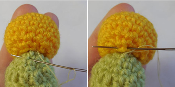Шить иголкой вперед, захватывая петли колобка и «пальчика», прошить по всей окружности. Удобно пришивать, одев «пальчик» на палец. Лучше сделать два шва по окружности. Сделать закрепительный стежок, иголку выколоть посередине колобка и, слегка натянув, обрезать. Кончик нити спрячется внутри колобочка.