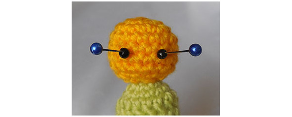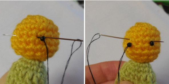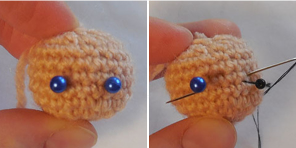 Кончик иголки вывести в месте расположения глазика, узелок втянуть внутрь колобка. Продеть бусину на иголку. Иголку вывести в месте расположения второго глазика.