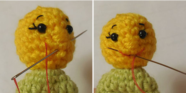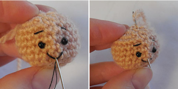 3. Кончиком нити, который остался от вязания головы, вышить носик (стежки вправо-влево):