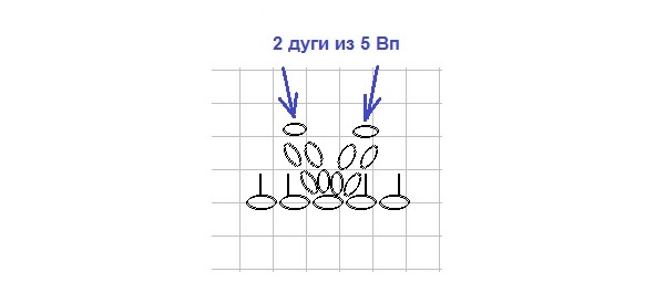 8 ряд. 11 Сбн, 2 дуги по 5 Вп за дальнюю сторону петли, 12 Сбн = 24 Сбн