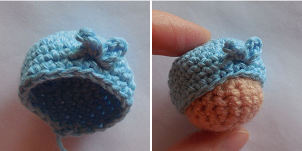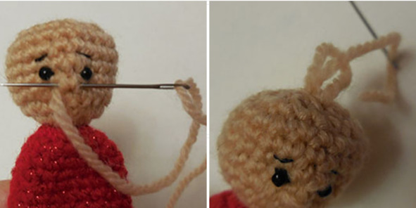 6. Одеть шапочку на голову, пришить шапку к голове кончиком нити от вязания шапки:
