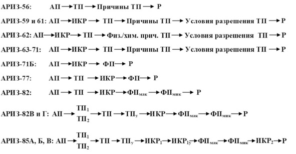 Детальный анализ истории развития АРИЗ4 и приемов разрешения противоречий5 был опубликован в работе [18, 19], где были собраны предыдущие материалы автора по исследованию всех известных ему модификаций АРИЗ, разработанных Г. С. Альтшуллером [1‒15]: АРИЗ-56, АРИЗ-59, АРИЗ-61, АРИЗ-62, АРИЗ-63, АРИЗ-64, АРИЗ-65, АРИЗ-68, АРИЗ-71, АРИЗ-71Б (75), АРИЗ-71В (75), АРИЗ-77, АРИЗ-82, АРИЗ-82А, АРИЗ-82Б, АРИЗ-82В, АРИЗ-82Г, АРИЗ-85А, АРИЗ-85Б, АРИЗ-85В. В частности, в работах [18, 19] автор показал эволюцию логики развития модификаций АРИЗ, которая представлена ниже.