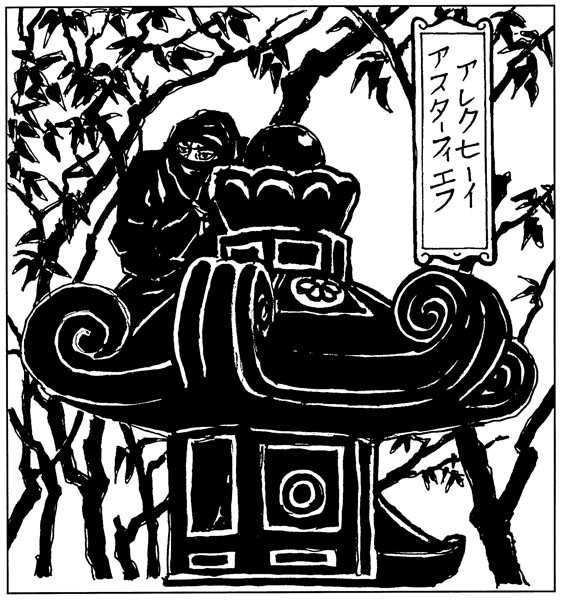 Ниндзя маскируется под каменный фонарь. Рисунок по мотивам японских гравюр