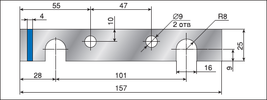 Хроническую «болезнь» двигателей ЗМЗ-402 – подтекание масла через сальниковое уплотнение заднего коренного подшипника – можно вылечить так. Снимите поддон картера двигателя и корпус держателя сальника у заднего конца коленчатого вала. Заменив асбестовый шнур (сальниковую набивку) новым длиной 140 мм и вложив его в гнездо держателя сальника, установите в пазы держателя резиновые прокладки (флажки). На боковые поверхности флажков, выступающие из пазов, нанесите мыльный раствор, а на верхние части – немного термостойкого герметика. Изготовьте пластину (см. рис.) и прикрепите ее снизу к держателю сальника двумя гайками М8. Установите держатель на место и затяните гайки его крепления через пазы пластины, а затем отсоедините пластину. Уплотнение заднего коренного подшипника станет намного надежнее.