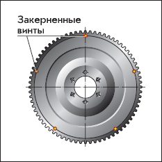 Бывает, что при попытках пустить двигатель возникают скрежещущие металлические звуки и звон, причем коленчатый вал то проворачивается стартером, то стоит на месте. Причина может быть в том, что венец маховика проворачивается на самом маховике. Проверить это можно, сняв стартер. Исправить неполадку можно, просверлив отверстия по стыку венца с маховиком в нескольких местах, нарезать в них резьбу и завернуть болты, которые затем обрезать и закернить, как показано на рисунке.