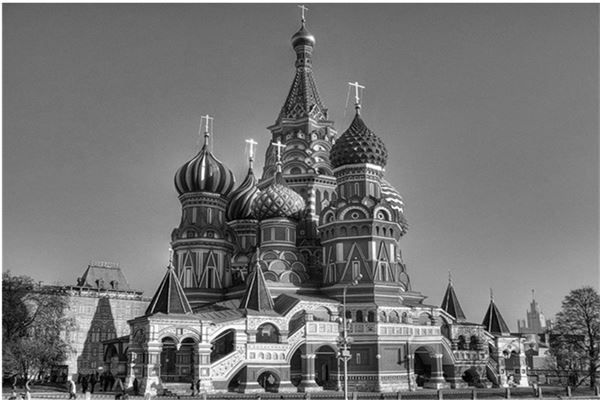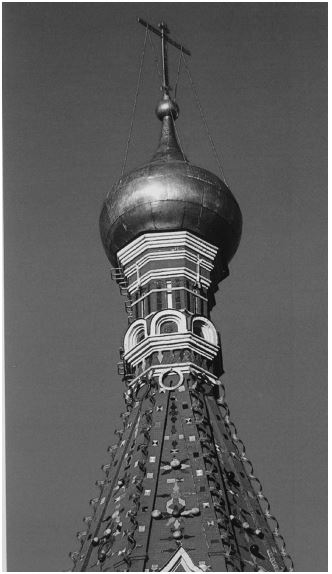 Однако в целом западноевропейским мотивам в орнаментике было отведено довольно скромное место: они лишь дополняют общий облик собора. Среди обширнейшего инструментария европейской готики и Ренессанса архитекторами отобраны преимущественно элементы, воспроизводящие характерные украшения русского зодчества. Опояски муфтированных колонок на гранях восьмерика под шатром напоминают не столько ренессансный руст, сколько стилизованные дыньки на основании арок церковных входов и прочитываются как древние «знаки силы». Линейные абрисы готических вимпергов на гранях церквей башенного типа зрительно повторяют рисунок зигзагообразных городков под шатрами деревянных церквей – прием, уже использованный при возведении Вознесенской церкви в Коломенском.[44]