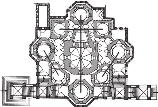 Вряд облик странного, громоздкого храма получил одобрение царя и митрополита. Центральный столпообразный объем переходит в высокий барабан, созданный восемью массивными сомкнутыми полуцилиндрами, между которыми зажаты щелевые окна. Над ярусом круглых кокошников центрального восьмерика выложен зигзагообразный пояс – ставший модным после возведения церкви Вознесения в Коломенском, но геометрически упрощенный мотив. Он троекратно повторен на конусах столпов над четырьмя приделами и над окнами по обе стороны от западного портала. Попытка неведомого зодчего создать собор нового облика, соединив элементы русского зодчества с «фантастической» архитектурой в духе поздней ренессансной эклектики,[57] оказалась явно неудачной. Вместе с тем план этой пятичастной церкви, объединяющий четыре придела вокруг центрального объема, получил логическое развитие в девятичастном плане храма Покрова Богородицы на Рву.