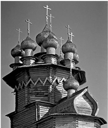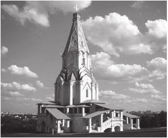 В облике церкви Вознесения в Коломенском собраны наиболее типичные черты русского деревянного зодчества: высокий шатер, круговое гульбище на столбах, мотив пламевидных завершений – наличников окон четверика и кокошников, тройным поясом соединяющих его с восьмериком, а затем повторенных в основании и на вершине шатра.[38]