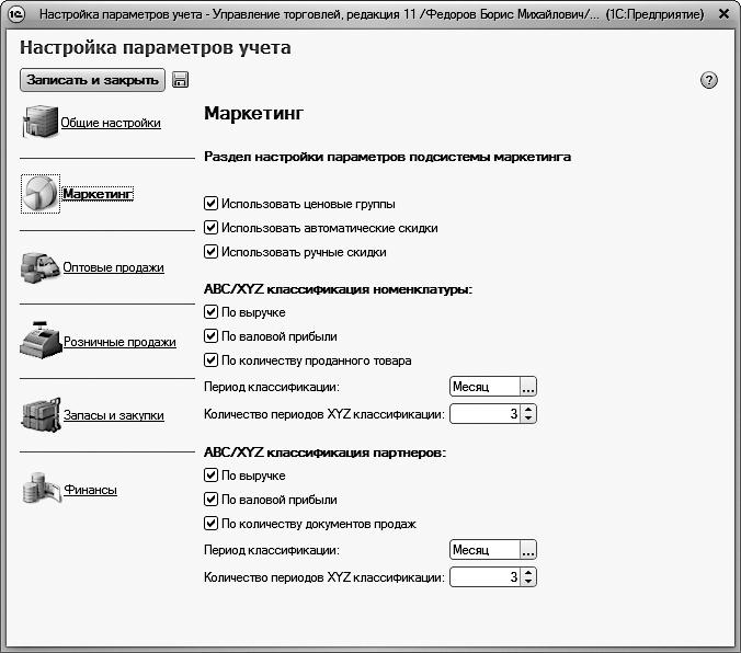 Возможности программы предусматривают выполнение ABC/XYZ-классификации номенклатуры и партнеров. Номенклатуру можно классифицировать по выручке, по валовой прибыли и по количеству проданного товара, а партнеров – по выручке, по валовой прибыли и по количеству документов продаж. Чтобы задействовать эти возможности, установите соответствующие флажки в разделе Маркетинг. При этом можно указать период классификации (месяц, год и др.), а также количество периодов классификации.
