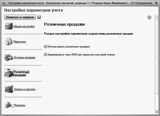 Если вы не намерены вести учет розничных продаж (например, предприятие осуществляет лишь оптовую торговлю), снимите флажок Использовать розничные продажи. В этом случае ссылка на соответствующий раздел исчезнет с панели разделов.