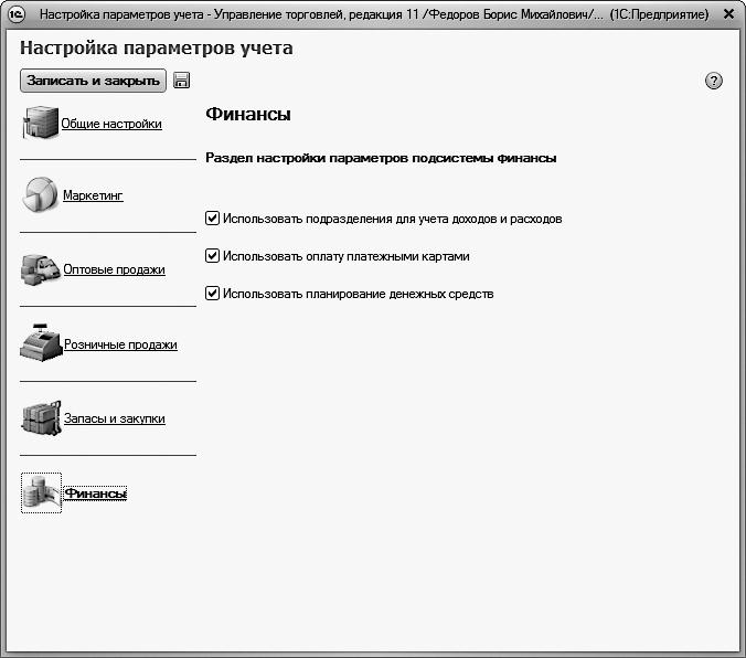 Все изменения, выполненные в окне настройки параметров учета, вступают в силу только после нажатия кнопки Записать и закрыть. Эта кнопка находится в верхней части окна и доступна независимо от того, какой раздел настройки открыт в данный момент.
