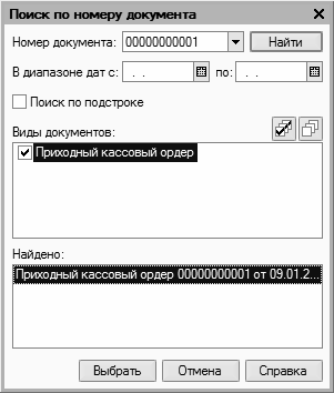 Процесс поиска в соответствии с заданными параметрами инициируется нажатием кнопки Найти; результаты поиска выводятся в нижней части окна в поле Найдено. Для быстрого перехода к требуемой позиции следует установить на нее курсор и нажать кнопку Выбрать. В результате окно Поиск по номеру документа автоматически закроется, а в окне списка курсор будет установлен на выбранный документ.