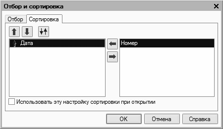 Если установить флажок Использовать эту настройку сортировки при открытии, то при последующих открытиях окна списка все позиции в нем будут по умолчанию отсортированы в соответствии с текущими настройками сортировки.