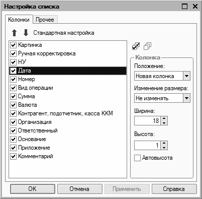 Окно состоит из двух вкладок: Колонки и Прочие. На вкладке Колонки путем установки соответствующих флажков следует указать колонки, которые будут отображаться в окне списка. По умолчанию установлены все флажки. Изменение порядка следования колонок в списке осуществляется с помощью кнопок со стрелками, которые находятся в левом верхнем углу вкладки. При необходимости можно быстро вернуться к настройке, используемой по умолчанию – для этого следует воспользоваться кнопкой Стандартная настройка.