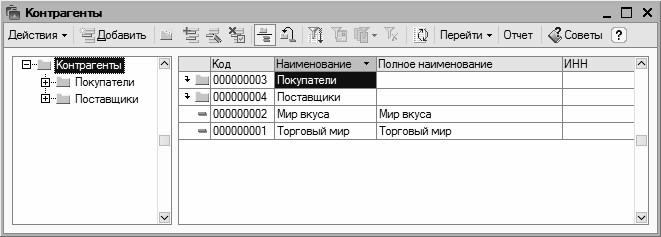 Как видно на рисунке, окно состоит из двух панелей: слева формируется перечень групп контрагентов (Покупатели, Поставщики, Заказчики и т. д.), а справа отображается содержимое текущей группы. Здесь мы привели это окно лишь для примера, а более подробно рассмотрим его при изложении урока, посвященного изучению справочника контрагентов.