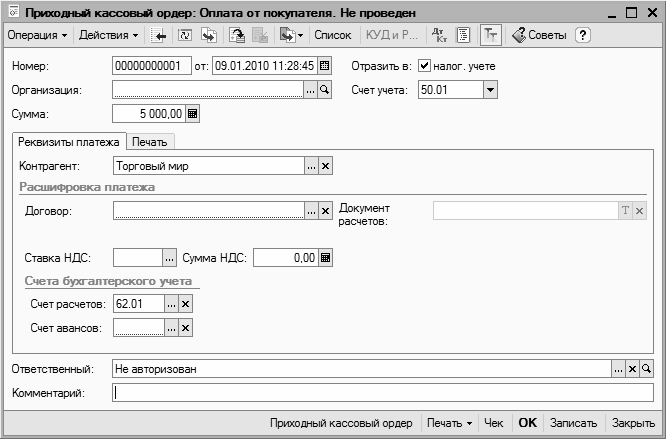 Отметим, что содержимое окна может зависеть от текущего режима работы. Например, при работе с кассовыми ордерами набор параметров в нем будет несколько отличаться от такого же окна в режиме работы с доверенностями или документами на приход товарно-материальных ценностей. Однако принцип работы от этого не меняется.