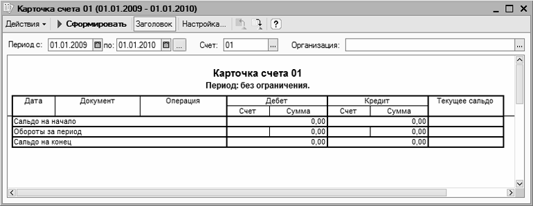 Здесь показано окно настройки и формирования одного из самых популярных отчетов – Карточки счета, но и большинство других отчетов формируются аналогичным образом. В верхней части окна задаются параметры формирования отчета (интервал времени, данные которого должны быть включены в отчет, счет бухгалтерского учета или наименование контрагента и др.), а в нижней части после нажатия кнопки Сформировать отобразится сам отчет. Позже мы подробно рассмотрим порядок получения наиболее популярных отчетов в программе ”1С:Бухгалтерия 8”.
