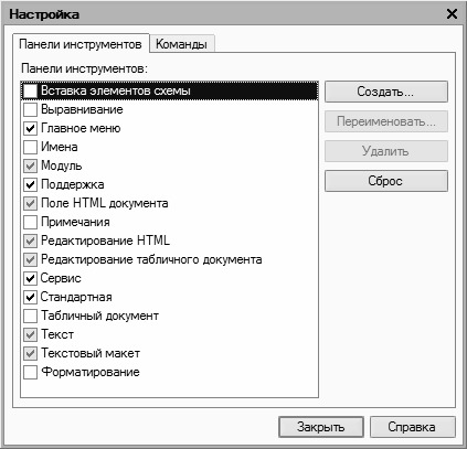 Изначально на вкладке Панели инструментов представлен перечень системных инструментальных панелей, заложенных в конфигурации. Эти панели нельзя переименовывать либо удалять. Однако вы можете самостоятельно создать любое необходимое количество пользовательских инструментальных панелей.