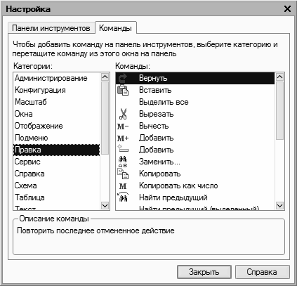 Все команды, имеющиеся в системе, в зависимости от своего функционального назначения объединены в тематические категории. Перечень этих категорий представлен в левой части вкладки Команды в поле Категории. В правой части этой вкладки в поле Команды отображается перечень команд, входящих в текущую категорию. Кроме этого, в поле Категории есть категория Все команды, включающая в себя все команды, имеющиеся в конфигурации.