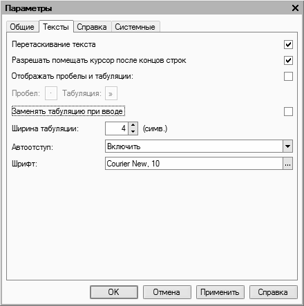 На вкладке Тексты выполняется настройка параметров работы с текстовыми данными. Если установлен флажок Перетаскивание текста, то при работе с блоками (выделенными фрагментами) текста можно будет выполнять его перетаскивание мышью с помощью метода drag & drop. При установленном флажке Разрешать помещать курсор после концов строк курсор в тексте можно будет помещать в конце строк; в противном случае – только перед символом "перевод строки", который устанавливается нажатием клавиши