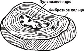 Диск состоит из пульпозного ядра, напоминающего по форме двояковыпуклую чечевицу, которое находится в центре диска. Объем ядра в норме составляет 1–1,5 см3.
