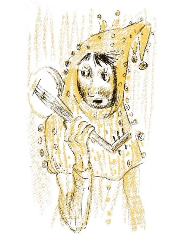 Шут шёл, то задирая девиц, притворно краснеющих от его шуток, то насмехаясь над каким-нибудь недотёпой-крестьянином, который, в ужасе от многолюдия, крепко прижимал к себе мешок с нехитрым скарбом и стремился сжаться во что-нибудь маленькое и неприметное, например в какую-нибудь букашечку или козявочку.