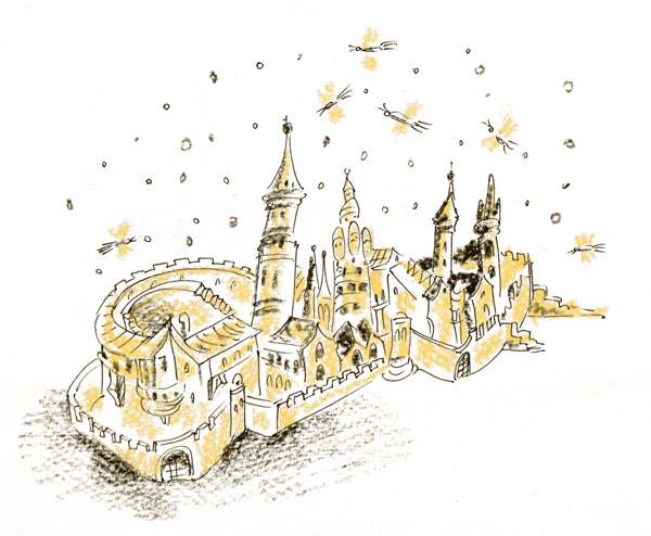 Совсем рядом с площадью высился величественный королевский дворец. Выстроенный ещё в незапамятные времена, он привлекал взгляды приезжих своей массивностью и неординарностью. Камни, вытесанные из светлого песчаника, были огромны и ноздреваты, местами словно потёкшие, оплавленные в одной огромной печи, придавшей им странные формы. Иногда так выглядит горящая свеча, воск которой, тая, накатывается волнами. Дворец тоже перетекал из одной формы в другую, из башни в башню, из балюстрады в балюстраду и казался неким фантастическим творением.