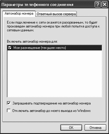 Функция автодозвона позволяет существующему подключению автоматически набирать номер телефона и соединяться с провайдером в случае разрыва связи, а также при любой попытке доступа к сетевым данным. Чтобы настроить автодозвон, на Панели управления необходимо выбрать категорию Сеть и подключения к Интернету, выделить нужное подключение, затем выполнить команду Дополнительно→Параметры удаленного доступа. Для установки автонабора в области Включить автонабор номера для: нужно установить флажок дозвона (рис. 1.1).