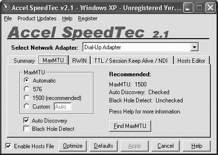 С помощью функций программы SpeedTec (http://www.montanasoft.com) можно оптимизировать целый ряд сетевых настроек интернет-соединения для всех устройств, доступных в системе. Параметры, допустимые для изменений, – сетевые настройки Windows: MaxMTU, RWIN, TimeToLive, SessionKeepAlive, a также величина кэша NDI и содержимое файла Hosts Editor со ссылками на веб-страницы быстрого доступа. Каждому виду параметров соответствует своя вкладка (рис. 1.13).