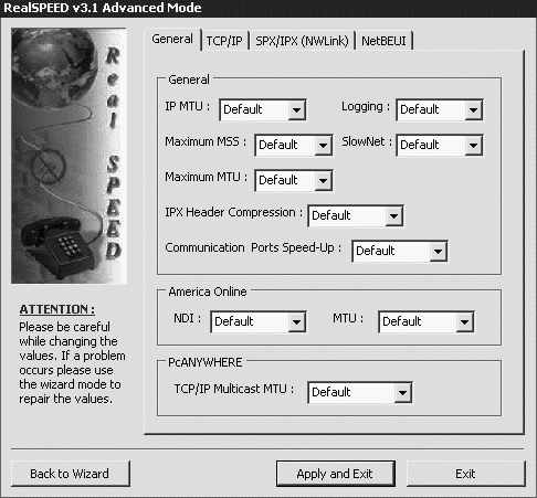 Для опытных пользователей существует режим Advanced, в котором практически все возможные параметры интернет-подключения можно установить вручную. Необходимые значения, такие как максимальный размер кэша или количество попыток соединения с сервером и др., задаются на вкладках TCP/IP, NetBEUI, SPX/IPX(NWLink) и General (рис. 1.15).