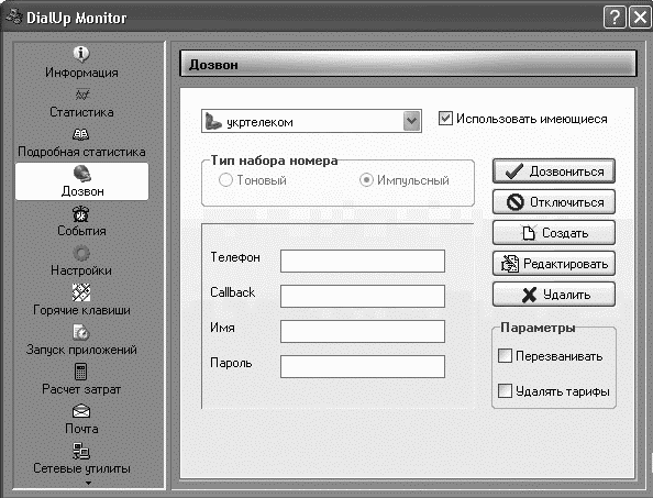 В разделе Статистика можно просмотреть детальную статистику по трафику и увидеть график загруженности интернет-канала. Подробную информацию по месяцам можно просмотреть в разделе Подробная статистика. Программа способна автоматически дозваниваться до провайдера по всем указанным соединениям, при этом в окне ее настроек можно задать все необходимые параметры: номер телефона, логин, пароль, необходимость повторного дозвона при наличии обратного звонка. DialUp Monitor позволяет использовать имеющиеся в системе номера дозвона, а также добавлять и настраивать новые непосредственно в окне программы (рис. 1.17).