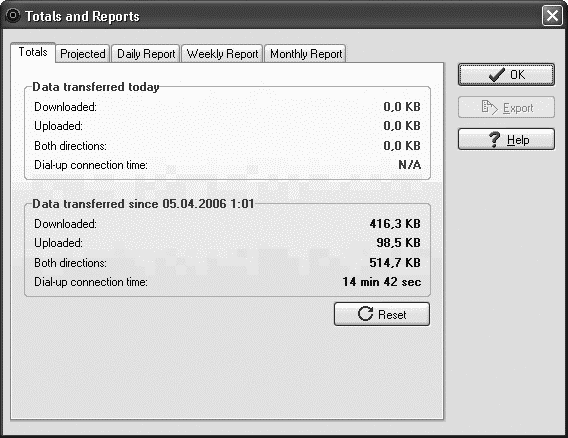Чтобы просмотреть статистику интернет-трафика, нужно воспользоваться пунктом Total. На вкладках появившегося окна представлены данные о трафике (входящем, исходящем и суммарном) за текущий день, неделю или месяц. Кроме того, программа подсчитывает итоговые данные и прогнозирует значения трафика (вкладка Projected). Сведения о трафике можно просмотреть не только в числовом значении (total), но и в виде таблицы – для этого в окне программы существуют специальные вкладки: daily reports, weekly reports и month reports.